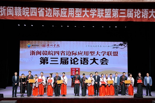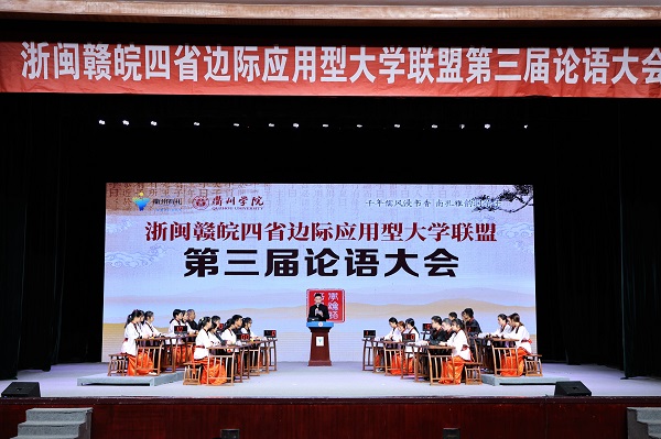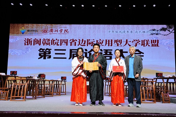 “孔子每到一个国家,用什么方法得知这个国家的政事?” “请说出《论语》中出现‘君’字的章句”......10月17日,衢州学院大会堂内座无虚席,浙闽赣皖四省边际应用型大学联盟第三届论语大会决赛鏖战正酣,来自衢州学院、武夷学院、上饶师范学院、黄山学院、衢州职业技术学院、衢州中专、衢州工程技术学校、衢州电大的8支代表队进行巅峰对决,上演了一场酣畅淋漓的儒学盛宴。孔子七十五世嫡长孙孔祥楷、孔子七十六世嫡长孙孔令立、“南孔圣地·衢州有礼”城市品牌打造专班专职副主任吴良军、衢州南孔文化发展中心主任盛雄生、衢州团市委副书记倪慧进,我校党委副书记吴耀光,党委委员、宣传部部长徐建芬以及参赛高校相关负责人,与千余名师生一同品读论语经典,感受先贤智慧,领略论语魅力。