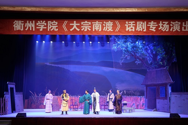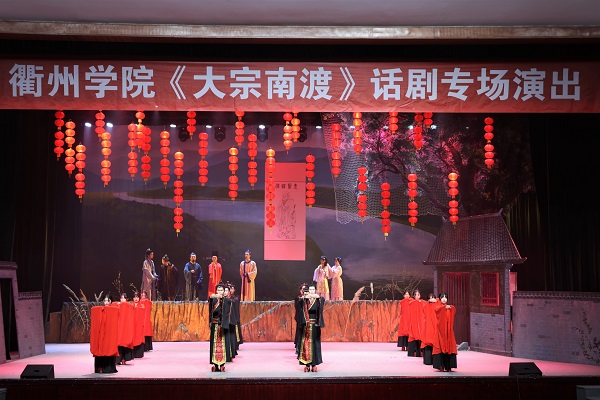 话剧《大宗南渡》由衢州学院党委宣传部、团委和南孔文化研究中心共同打造,目目艺社、南孔剧社共同参演。该剧历时8个月精心打磨,演员全部为我校在校大学生。孔传的扮演者林奇斌说:“这次表演对我而言是一次非常大的挑战,因为孔传的人物设定是一个七十多岁的老人家,所以不论是在声音、体态、动作、情绪表达上都要有老人的感觉,对于我一个二十多岁的大小伙儿真的很不容易。为了贴近角色,我不断尝试,对台词精准琢磨,对人物细细揣摩,尽可能的去靠近他。从零基础到亮相演出,我对大宗南渡的历史和传统文化也有了更深的理解。”