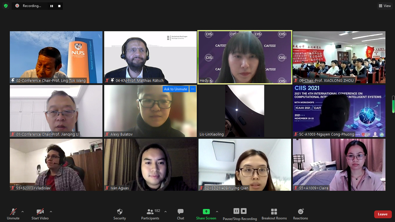 会议于11月21日上午正式开幕,大会主席澳门科技大学李建庆教授致开幕词,大会副主席衢州学院电气与信息工程学院院长王卓然教授致欢迎词。本次大会共有4个大会主题报告,3个特邀报告,71个口头报告。会议邀请了4位国内外人工智能领域知名专家做大会主题报告,分别为SPIE/IEEE/IAPR/AAAI/ACM Fellow美国罗彻斯特大学Jiebo Luo教授(报告题目:COVID-19: What social media and machine learning can inform us)、IEEE/CAAI Fellow清华大学孙富春教授(报告题目:Robot skill learning: imitation, transfer and enhancement)、ER Fellow/IEEE Senior Life Member新加坡国立大学Tok Wang Ling教授(报告题目:Conceptual modeling views of relational databases vs big data and machine learning)和德国瑞特灵根大学Matthias Ratsch教授(报告题目:Humanoid robots and artificial super intelligence – The terminating end or the last hope for humans?)。会议吸引了来自美国、英国、新加坡、德国、日本、印度、菲律宾、泰国、马来西亚、南非、奥地利、中国等十余个国家和地区的近200位学者线上参会,我校作为承办单位组织了两个分会场,共计150余名师生参会并与专家学者进行了线上交流互动。
