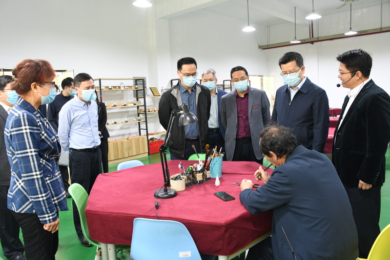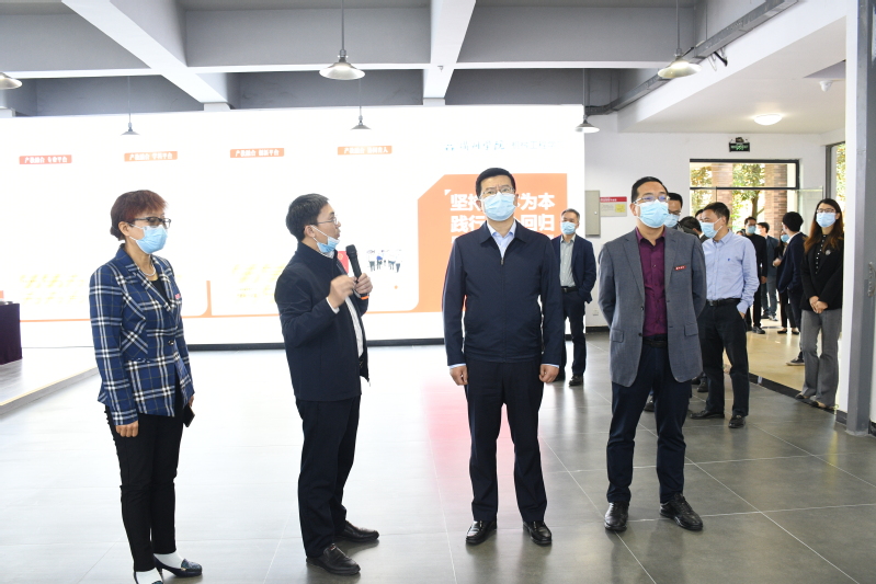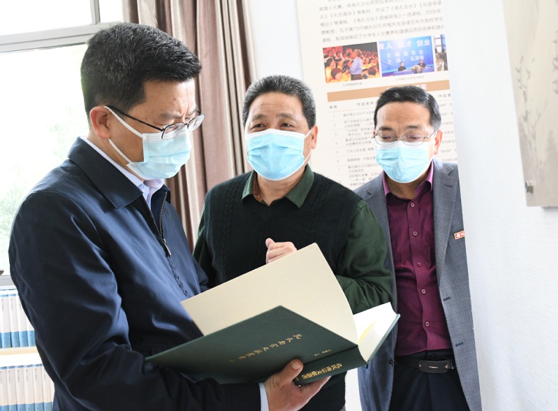 邓崴一行参观走访了产教融合中心、创业学院、南孔文化研究成果展厅,详细了解学校服务地方举措,大学生创新创业情况和构筑南孔文化研究高地的做法。在产教融合中心,他仔细了解校企合作开展情况,对我校融入地方、服务地方的做法表示赞赏,鼓励学校加大科创力度和成果转化,为衢州发展贡献高校智慧。在创业学院的蛋雕非遗实训室,他仔细观看了“蛋雕”的手工艺创作和学生动手制作的模型,对我校开设非遗传承人工作室,引进陶艺、蛋雕等非遗手工课,让本土非遗文化融入劳动教育的做法点赞。在南孔文化研究成果展厅,他听取了由我校吴锡标老师牵头编纂出版的《孔氏南宗文献丛书》的介绍,对学校将孔氏南宗文献进行全面系统的搜集汇编表示肯定,希望学校继续深入开展南孔文化研究,用高校智慧激活传统文化,构筑四省边际文化的新高地。当看到由我校徐明老师设计的“南孔爷爷”等城市IP形象造型各异、憨态可掬,他表示,IP市场前景广阔,希望学校加大创新力度,将新时代衢州精神提炼概括后融入IP表情包,打造具有影响力的城市文创品牌符号。