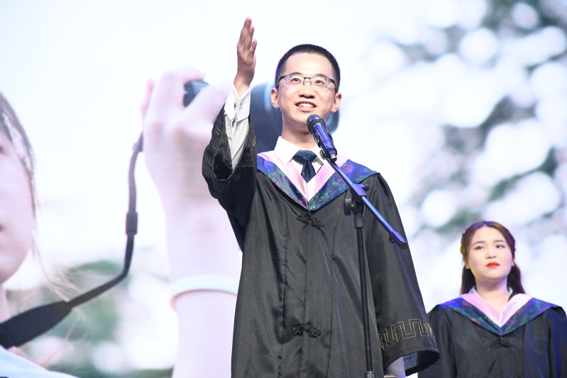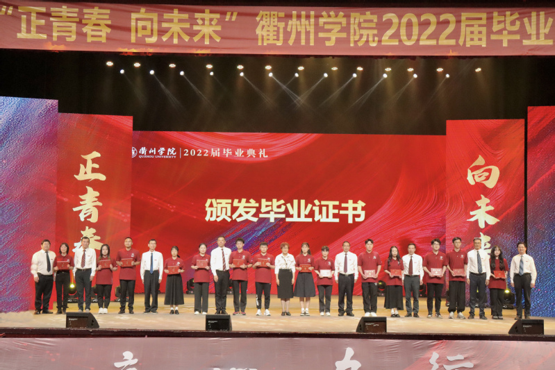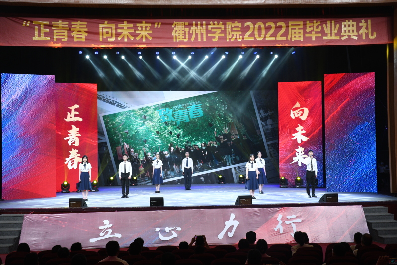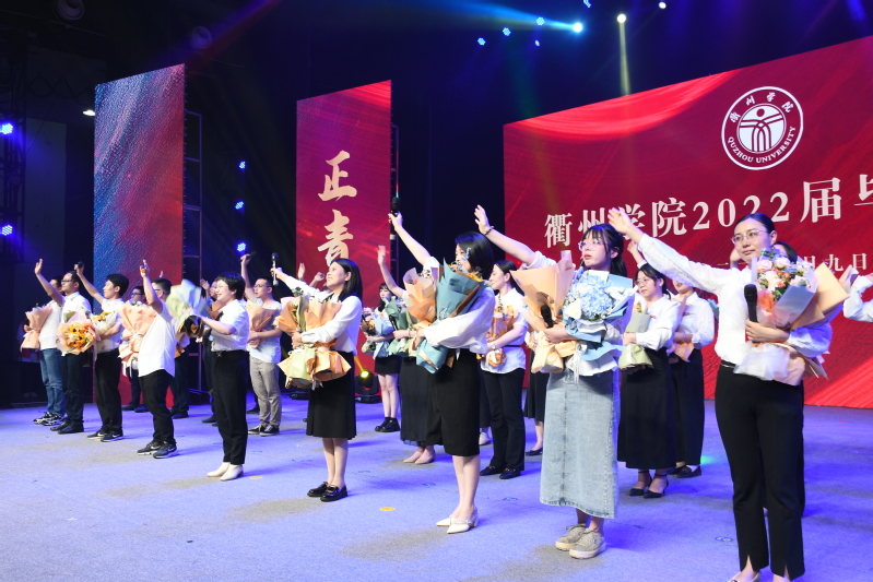 典礼在集体奏唱国歌声中拉开帷幕。“柯山神秀,悠悠衢江,菁菁校园,花木含香。又是一年夏花盛开的季节,繁花似锦挡不住脚步匆匆,就让我们的记忆定格吧,留住这双十年华的青春模样……”00后新时代理论宣讲团带来的原创诗朗诵《青春奋斗再起航》,深情地回顾了在衢院难忘的奋斗时光,表达了对未来生活再起航的憧憬。在《衢院奋斗时光》环节,主会场和分会场毕业生代表们分享了在校期间的奋斗故事,展现了毕业生们勇于追梦、勤奋拼搏的向上风貌;毕业生代表们徐徐吟唱《凤凰花开的路口》,师生情、同窗情溢满心间。