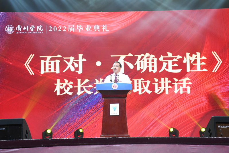 校长郑友取以《面对·不确定性》为题寄语2022届毕业生。他情真意切地表达了对毕业生们的感谢与祝福。面对毕业生将面临的夹杂着变数和不确定的环境,他送出三个“锦囊”:一是保持“乱云飞渡仍从容”的淡定心态。面对种种不安、焦虑、困惑甚至害怕,必须学会控制情绪,作出力所能及的改变,始终保持接纳心、平常心,把握好当下可控的事,以自身的确定性应对外在的不确定性。希望同学们对这个时代充满信心,积极拥抱变化,时刻准备明天的到来。二是锻造“千磨万击还坚劲”的过硬本领。不要把自己的能力局限于某个领域,要“灵性觉醒”,独立思考、理性判断,勇于去改变可以改变的一切,行动是应对不确定性的最佳答案。希望同学们跳出自己的信息茧房,时刻保持清醒的头脑,做到“自我清明”。三是坚守“风物长宜放眼量”的长期主义。坚持长期主义实质是自我成长,重在平衡短期利益与长期效益、眼前的失与长远的得、现实和理想等关系。未来已来,希望同学们坚持“咬定青山不放松”的目标定力,不因逆境和挫折而改变航向,不因诱惑和压力而随波逐流。