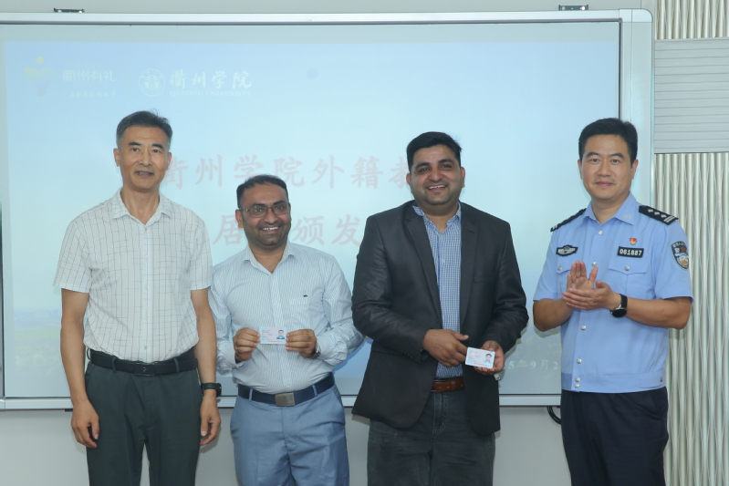 9月29日上午,衢州市公安局出入境管理支队支队长郑峰一行来校,调研外籍师生管理服务工作,并为我校两名外籍教师颁发外国人永久居留身份证(简称“五星卡”)。这是我校首次有外籍教师成功申领该证件,标志着学校引才工作取得新进展。副校长郑文山出席会议,国际处、人事处负责人参会交流。