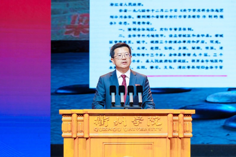 高屹代表市四套班子和253万衢州人民,向衢州学院全体师生、校友致以诚挚祝贺,向长期以来关心支持衢州建设发展的社会各界人士表示衷心感谢。他充分肯定衢州学院建校40年来取得的显著成绩和对衢州经济社会发展作出的重要贡献,并围绕“清醒地知道自己是谁”“清楚地知道自己想要什么”“清晰地知道如何实现自己的目标”三个问题,进一步明确衢州学院的发展定位、发展目标和发展路径,希望衢州学院深入贯彻落实习近平总书记关于教育的重要论述精神,按照省委建设高等教育强省部署,以全方位融入和服务衢州经济社会发展为己任,奋力走好立德树人、内涵发展、校城融合之路,加快建设高水平特色鲜明的应用型大学。