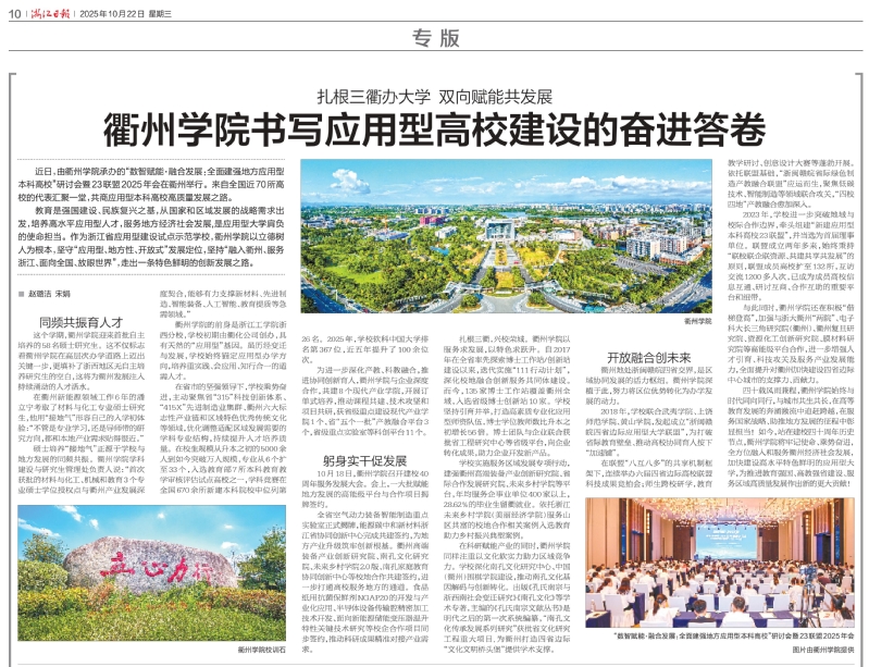 10月22日,《浙江日报》以《扎根三衢办大学 双向赋能共发展 衢州学院书写应用型高校建设的奋进答卷》为题,报道我校高质量发展成果。