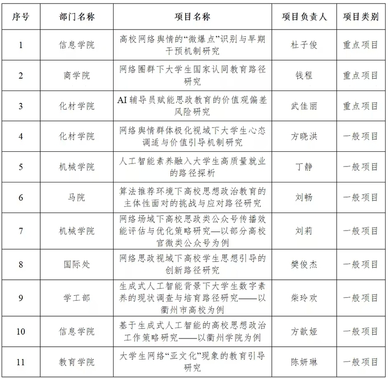 根据《关于组织申报衢州学院2025年度网络思想政治教育工作研究课题的通知》要求,结合学校实际申报情况,经个人申报、专家评审,拟对其中11个项目进行立项,其中重点项目3项、一般项目8项(详见附件)。现将评审结果予以公示。