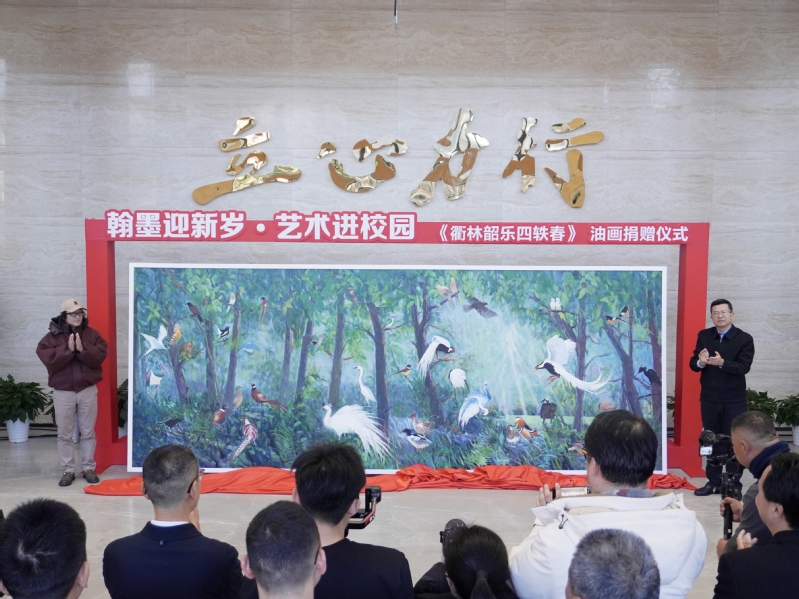 活动现场举行了《衢林韶乐四轶春》油画捐赠仪式。该作品宽5米、高1.9米,由罗剑华与阮渭平联袂创作,以形色光影描绘了衢州山川育秀、文脉绵长的生机图景。画中层林叠翠,绿意涌动,四十只飞鸟姿态各异、灵动自然,既呼应衢州“国家森林城市”的生态底色,也寓意着在衢州建市和衢州学院建校四十载的光阴中,城市与学校的同频共振、蓬勃发展。