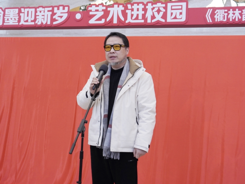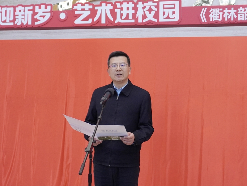 邓崴在致辞中代表学校向两位画家致以衷心的感谢。他指出,学校扎根南孔圣地,浸润千年文脉,始终坚持“五育并举”,深耕以文化人、以文育人实践,把美育作为涵养师生品格、增强文化自信的重要路径。他表示,这幅作品将成为校园艺术教育的生动教材,让更多师生在笔墨丹青的熏陶中潜移默化涵养品格、陶冶情操。学校也将以此次活动为契机,始终把美育作为立德树人的重要抓手,坚持以美育德、以美育人,和社会各界携手让更多艺术走进校园、走近师生。