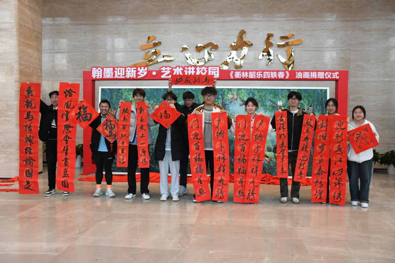 1月14日下午,“翰墨迎新岁・艺术进校园”活动在衢州学院训研创大楼举行。校党委书记邓崴,校党委副书记章剑锋,浙江画院副院长、一级美术师余宏达,衢州市文联党组书记、主席汪群,浙江画院学术委员会委员、一级美术师罗剑华,衢州市书法家协会主席龙凤,衢州市美术家协会副主席、衢州学院副教授阮渭平,浙江画院、衢州市书法家协会的书法家代表,学校相关单位负责人及师生代表参加活动。校党委副书记吴耀光主持活动。