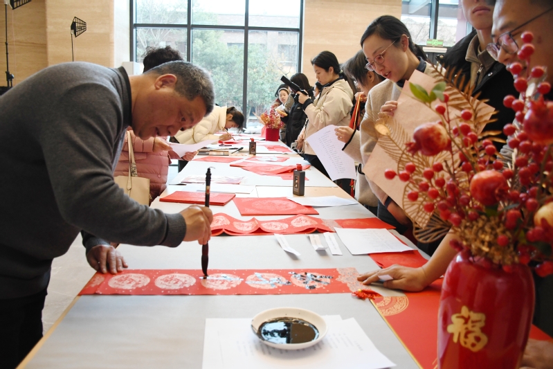 仪式结束后,浙江画院、衢州市书法家协会的书法家代表携手衢州学院书法协会的师生挥毫泼墨,现场写春联、送祝“福”。师生们围拢在桌前,满心欢喜迎接新春祝福。